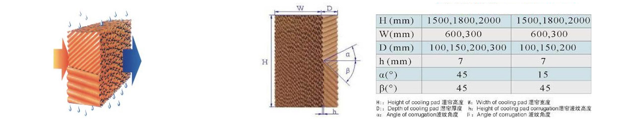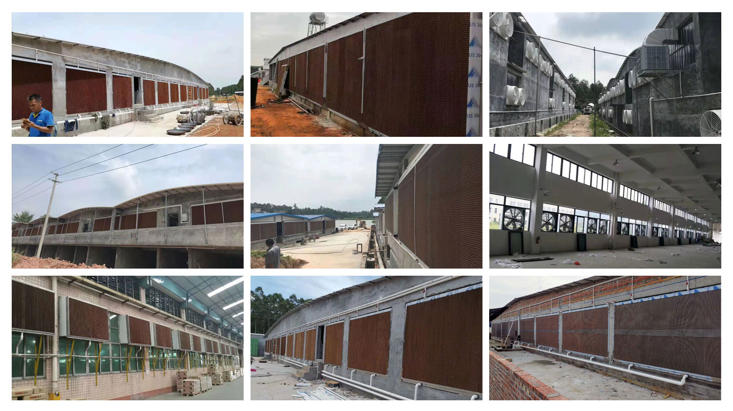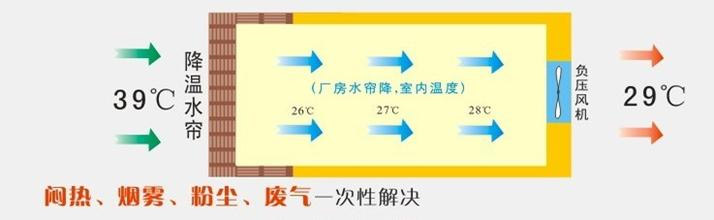 濕簾裝在密閉房舍一端山墻或側(cè)墻上,風機裝在另一端山墻或側(cè)墻上,降溫風機抽出室內(nèi)空氣,產(chǎn)生負壓迫使室外的空氣流經(jīng)多孔濕潤濕簾表面時,使空氣中大量熱量進行轉(zhuǎn)化處理從而迫使進入室內(nèi)的空氣降低10-15℃,并不斷的引入室內(nèi)進行防暑降溫。