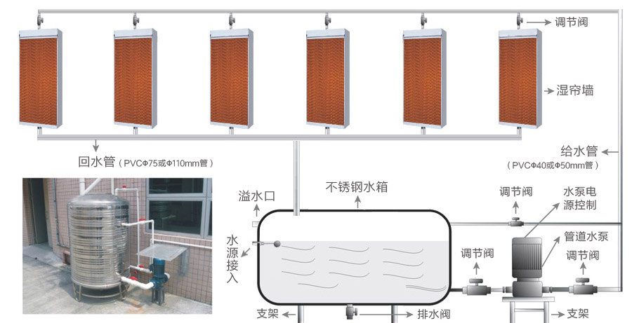 水簾主要由高分子水簾紙組成,濕紙簾是一種特殊的產(chǎn)品,經(jīng)過特殊處理,結(jié)構(gòu)強度高,耐腐蝕,使用周期達六年以上。我們可以從水簾紙的透光性中看出較低的阻力與透氣性這說明水簾紙具有優(yōu)良的透氣與濕水性,可以保證水均勻的淋透整個水簾墻,水簾是紙的立體空間設(shè)計為水和空氣的熱交換提供了蒸發(fā)的最大表面積,高耐水性能又具有較大的蒸發(fā)比,水簾的外框有鋁合金或者鍍鋅板做成,選擇這兩種材料的目的是防止生銹,外框的結(jié)構(gòu)是經(jīng)過精心設(shè)計的,上邊框里面有安裝進水管的卡槽,進水管可以固定在上邊框的里面,進水口在中間,水從進水口流入之后經(jīng)過進水管均勻的向整個紙簾分散,安裝外邊框的時候先在上邊框中放置一排橫向的紙簾,這些橫向的紙簾起著分水的作用,保證整個紙簾均勻的向下滲水,再把已經(jīng)準備好的水簾紙并列排起來放進接好的框架中,把已經(jīng)拼接好的水簾紙豎放起來然后在水簾的四邊鉆孔同時用氣釘固定,這樣一個水簾就制作完成了。