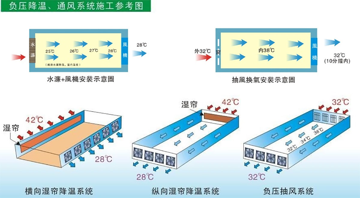 負壓風機主要是利用空氣對流,負壓換氣的降溫原理,由安裝地點的對向---大門或窗戶自然吸入新鮮空氣,將室內(nèi)悶熱氣體迅速強制排出室外.而水簾風機降溫系統(tǒng)是由紙質(zhì)多孔濕簾、水循環(huán)系統(tǒng)、風扇組成。未飽和的空氣流經(jīng)多孔、濕潤的濕簾表面時,大量水分蒸發(fā),空氣中由溫度體現(xiàn)的顯熱轉(zhuǎn)化為蒸發(fā)潛熱,從而降低空氣自身的溫度。風扇抽風時將經(jīng)過濕簾降溫的冷空氣源源不斷的引入室內(nèi),從而達到降溫效果。